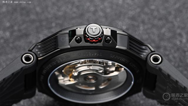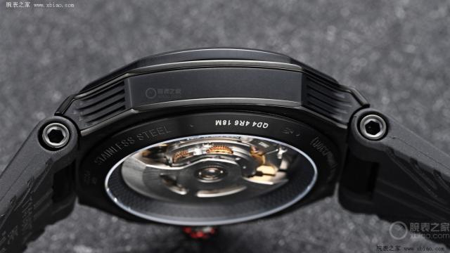 表側(cè)覆有PVD黑色涂層,呈現(xiàn)出磨砂質(zhì)感。同時,表側(cè)借鑒了摩托車引擎散熱片的凹槽設計,充滿機車風。