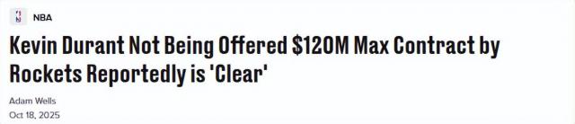 北京時(shí)間10月18日,凱文·杜蘭特即將開(kāi)啟加盟火箭隊(duì)的首個(gè)賽季,而這也是他當(dāng)前合同的最后一年。然而,他似乎難以獲得一份頂薪續(xù)約合同。據(jù)ESPN名記文霍斯特透露,情況“很明確”,火箭隊(duì)尚未向杜蘭特提供他有資格獲得的2年1.2億美元續(xù)約報(bào)價(jià)。若球隊(duì)有意,這份合同“現(xiàn)在早該談妥了”。
