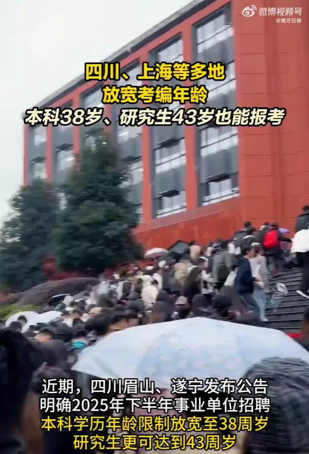 從今年下半年起,四川遂寧、眉山等地明確,事業(yè)單位招聘中,本科生年齡限制放寬到 38 周歲,研究生放寬至 43 周歲。