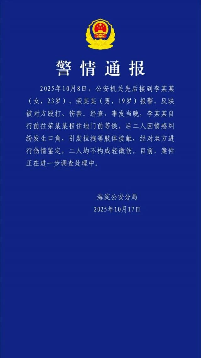 10月17日,北京海淀公安分局發(fā)布警情通報(bào):2025年10月8日,公安機(jī)關(guān)先后接到李某某 (女,23歲)、榮某某 (男,19歲) 報(bào)警,稱被對方毆打、傷害。經(jīng)調(diào)查,事發(fā)當(dāng)晚,李某某自行前往榮某某租住地門前等候,之后二人因情感糾紛發(fā)生口角,進(jìn)而引發(fā)拉拽等肢體接觸。經(jīng)對雙方進(jìn)行傷情鑒定,二人均不構(gòu)成輕微傷。目前,案件正在進(jìn)一步調(diào)查處理中。