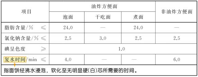 《方便面》(GB/T 40772 - 2021)中規(guī)定,非油炸方便面面餅復(fù)水時間比油炸方便面稍長。