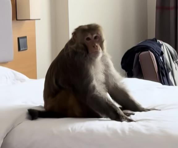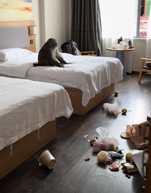 男子西藏旅游回酒店,竟見猴子端莊坐床上,零食散落一地