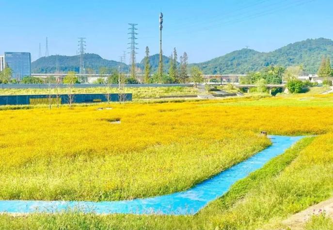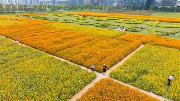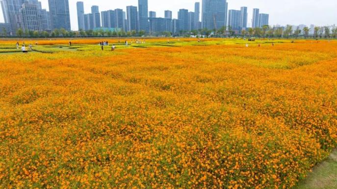 在廣闊的CBD田園環(huán)繞中,總面積約15000平方米的大地花海景觀“杭州之窗”正燦爛開(kāi)放。金黃是這片花海的主色調(diào),大片的硫華菊與百日草交織成海,以最熱烈的色彩,描繪出秋收的輝煌。