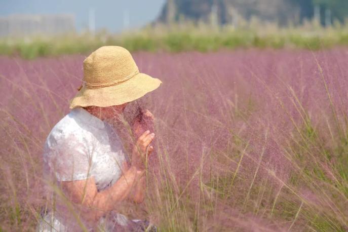遠(yuǎn)遠(yuǎn)望去,成片的粉黛亂子草輕柔如夢(mèng),將土地染成少女般的緋紅。行人在其中漫步,仿佛置身于一大團(tuán)如煙似霧的粉紫色云霞之中。