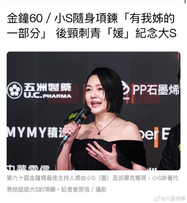 比骨灰項鏈更引人注目的是,她脖子后方新紋了個“媛”字。這個字取自大S本名“徐熙媛”,是小S親筆寫的,好友范曉萱幫忙刺青,這就像在身體上刻下了和姐姐永遠(yuǎn)的聯(lián)結(jié)。領(lǐng)獎時,她隔空對大S說:“姐你真的很罩,應(yīng)該交到很多法力很強的朋友”,話里有思念,也有帶著淚光的調(diào)侃。