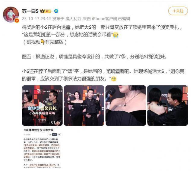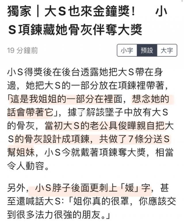 10月17日晚,剛獲得第60屆金鐘獎綜藝節(jié)目主持人獎的小S,在后臺爆出驚人消息——她親口證實,脖子上那條備受關(guān)注的項鏈里,裝的是已故姐姐大S的骨灰。