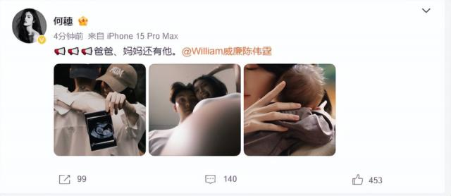 仔細看這張合照,原來是何穗的孕照,也能算是一家三口的合照了。何穗的肚子很大,兩人的表情也十分搞笑。