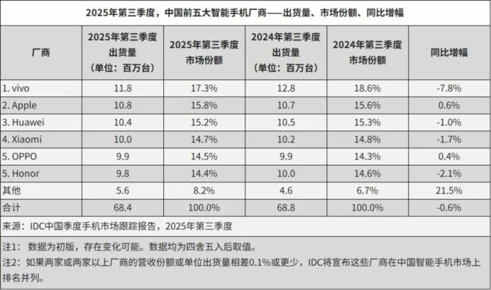 據(jù)國際數(shù)據(jù)公司(IDC)最新季度手機跟蹤初步數(shù)據(jù),2025年第三季度,全球智能手機出貨量達3.227億部,同比增長2.6%。在高端市場帶動下,智能手機市場延續(xù)復(fù)蘇態(tài)勢,創(chuàng)新外觀設(shè)計與高性價比AI智能手機吸引消費者升級設(shè)備,成為市場增長關(guān)鍵動力。而中國智能手機出貨量約6840萬臺,同比下降0.6%。