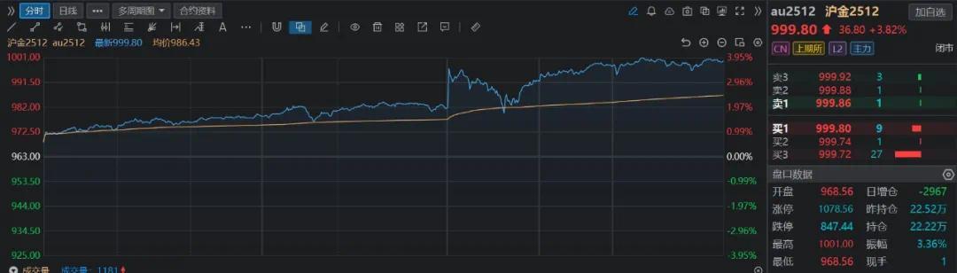 從國內(nèi)市場行情來看,10月17日,國內(nèi)貴金屬期貨市場呈現(xiàn)強(qiáng)勢上漲態(tài)勢。滬金期貨主力合約(AU2512)盤中突破1000元/克整數(shù)關(guān)口,創(chuàng)下歷史新高。截至17日15時(shí)收盤,滬金期貨主力合約報(bào)999.80元/克。