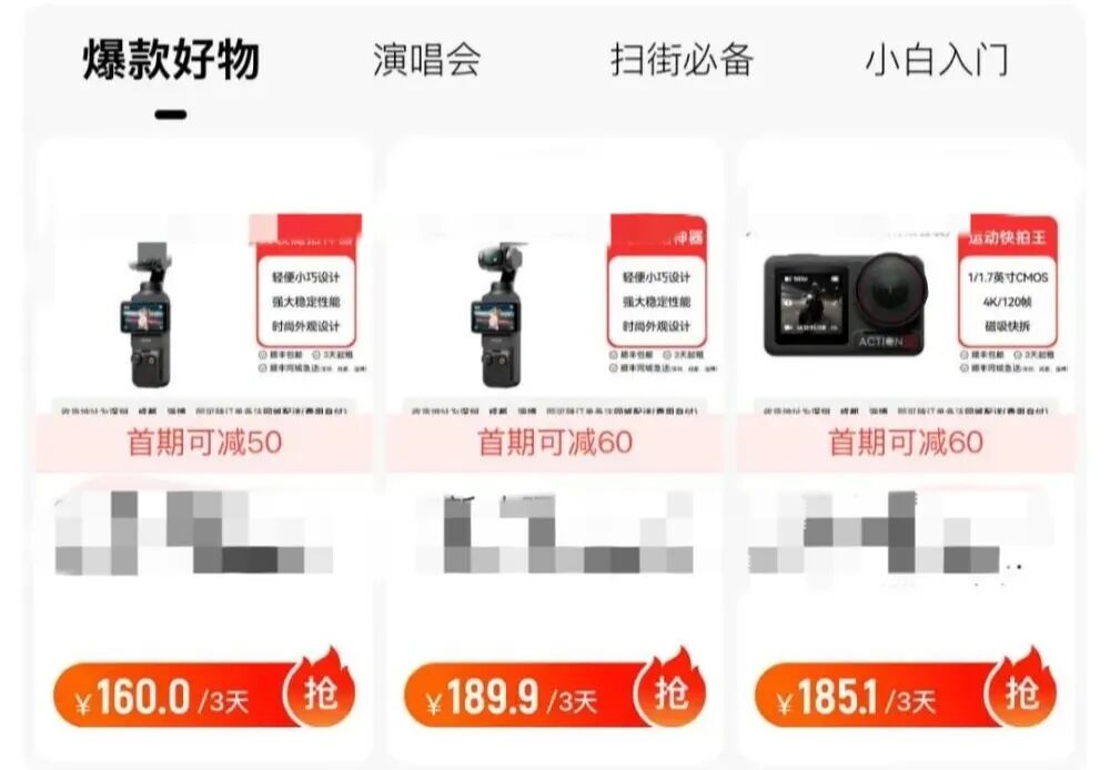 當(dāng)你還在為滿街的運(yùn)動(dòng)相機(jī)感嘆時(shí),那些嘟嘴自拍的年輕人早已覺得沒必要自己花錢買。在移動(dòng)互聯(lián)網(wǎng)能滿足各種消費(fèi)需求的當(dāng)下,買的不一定比租的劃算。愛旅游的白領(lǐng)小魚說,她今年多次通過閑魚、愛租機(jī)等二手租借平臺(tái)租運(yùn)動(dòng)相機(jī),像被調(diào)侃為“電子茅臺(tái)”的大疆Osmo Pocket 3、“i人自拍神器”影石360 Go 3S,還有該品類的鼻祖Go Pro。目前主流運(yùn)動(dòng)相機(jī)售價(jià)在2000 - 3000元,租一周價(jià)格通常是售價(jià)的十分之一。小魚覺得租一周兩三百塊,比買下來合算。對于一年只用一次年假長途游玩的年輕人,租著用更劃算,而且按運(yùn)動(dòng)相機(jī)的迭代速度,明年能租到更新款。二手平臺(tái)“轉(zhuǎn)轉(zhuǎn)”租賃專區(qū)發(fā)布的熱門產(chǎn)品,運(yùn)動(dòng)相機(jī)穩(wěn)居前列。(圖/平臺(tái)截圖)