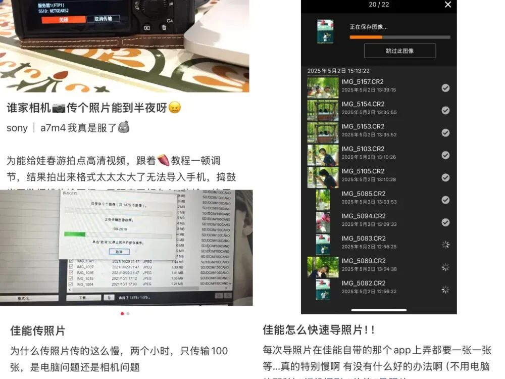 和傳統(tǒng)單反、微單不同,運(yùn)動(dòng)相機(jī)在聯(lián)網(wǎng)傳輸方面體驗(yàn)更好。小魚覺得自己普通的拍攝技術(shù),經(jīng)運(yùn)動(dòng)相機(jī)自帶濾鏡和logo加持,看起來都“高級”了。網(wǎng)友吐槽相機(jī)傳輸圖片不便。(圖/社交媒體截圖)
