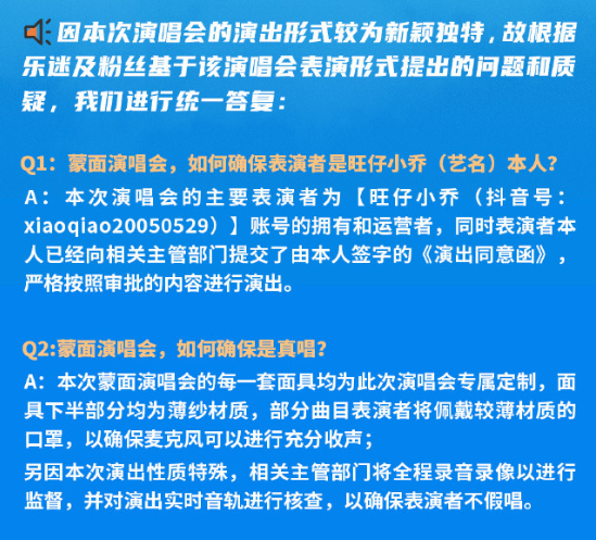 面對質(zhì)疑和聲討,主辦方緊急表示,演出會嚴(yán)格按審批內(nèi)容進(jìn)行,保證表演的人就是旺仔小喬賬號的擁有者和運(yùn)營者。蒙面演唱會的每一套面具均為定制,下半部分為薄紗材質(zhì),確保麥克風(fēng)可以充分收聲,相關(guān)主管部門會全程錄音錄像進(jìn)行監(jiān)督,確保表演者不假唱。