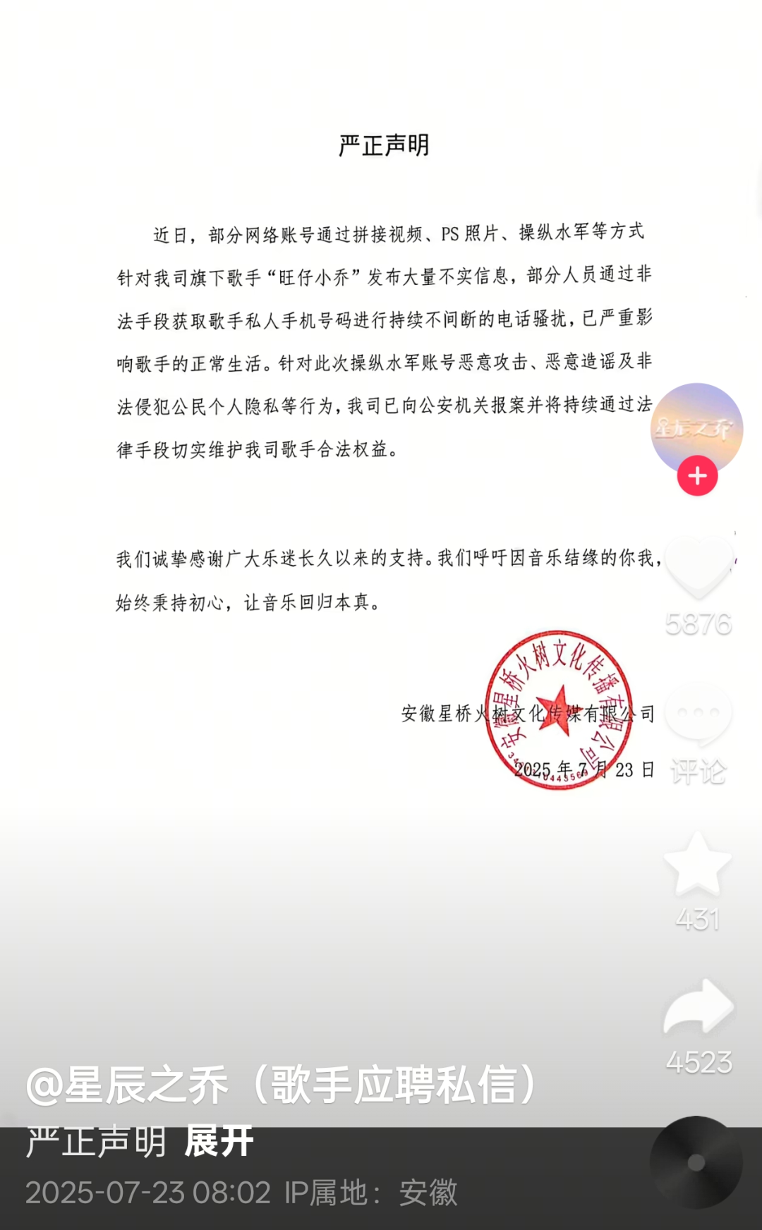 對此,旺仔小喬經(jīng)紀(jì)公司在抖音賬號“星辰之喬”上發(fā)布聲明,稱部分網(wǎng)絡(luò)賬號通過拼接視頻、PS照片、操縱水軍等方式針對旺仔小喬發(fā)布大量不實(shí)信息,部分人員通過非法手段獲取歌手私人手機(jī)號碼進(jìn)行持續(xù)不間斷的電話騷擾,已嚴(yán)重影響歌手正常生活。公司已向公安機(jī)關(guān)報(bào)案并將持續(xù)通過法律手段維護(hù)歌手合法權(quán)益。