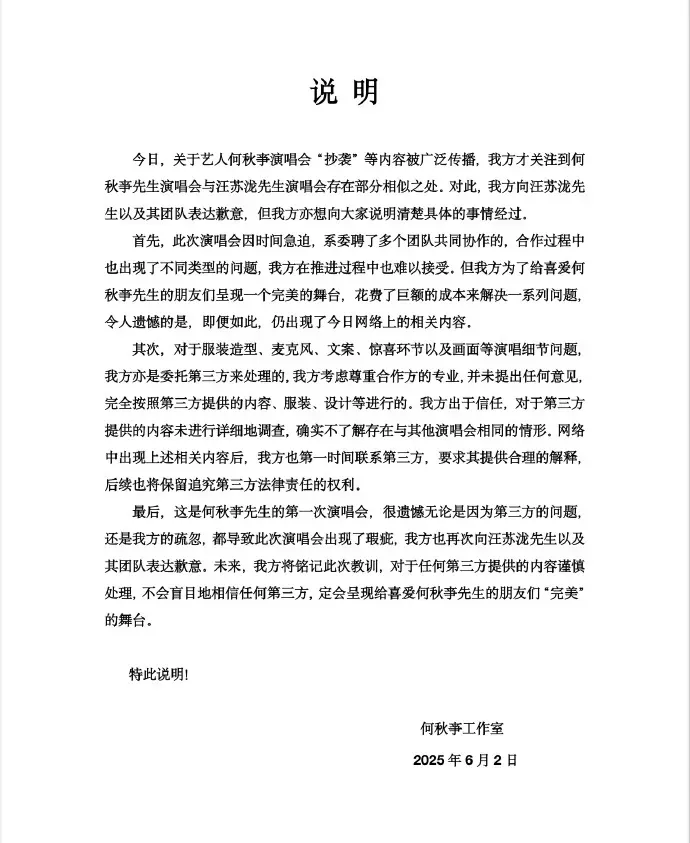 面對輿論壓力,何秋亊工作室發(fā)布道歉聲明,稱“此次演唱會因時間急迫,系委聘了多個團(tuán)隊(duì)共同協(xié)作的”“對于服裝造型、麥克風(fēng)、文案、驚喜環(huán)節(jié)以及畫面等演唱細(xì)節(jié)問題我方亦是委托第三方來處理的……我方出于信任,對于第三方提供的內(nèi)容未進(jìn)行詳細(xì)地調(diào)查,確實(shí)不了解存在與其他演唱會相同的情形”,頗有甩鍋給第三方的意味,網(wǎng)友并不買賬。