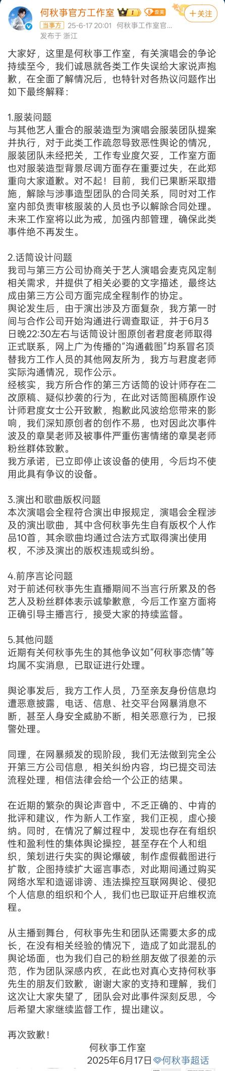6月中旬,何秋亊工作室再次發(fā)布聲明解釋爭議、明晰責(zé)任,但該事件還是影響了他的公眾形象和信譽(yù)。