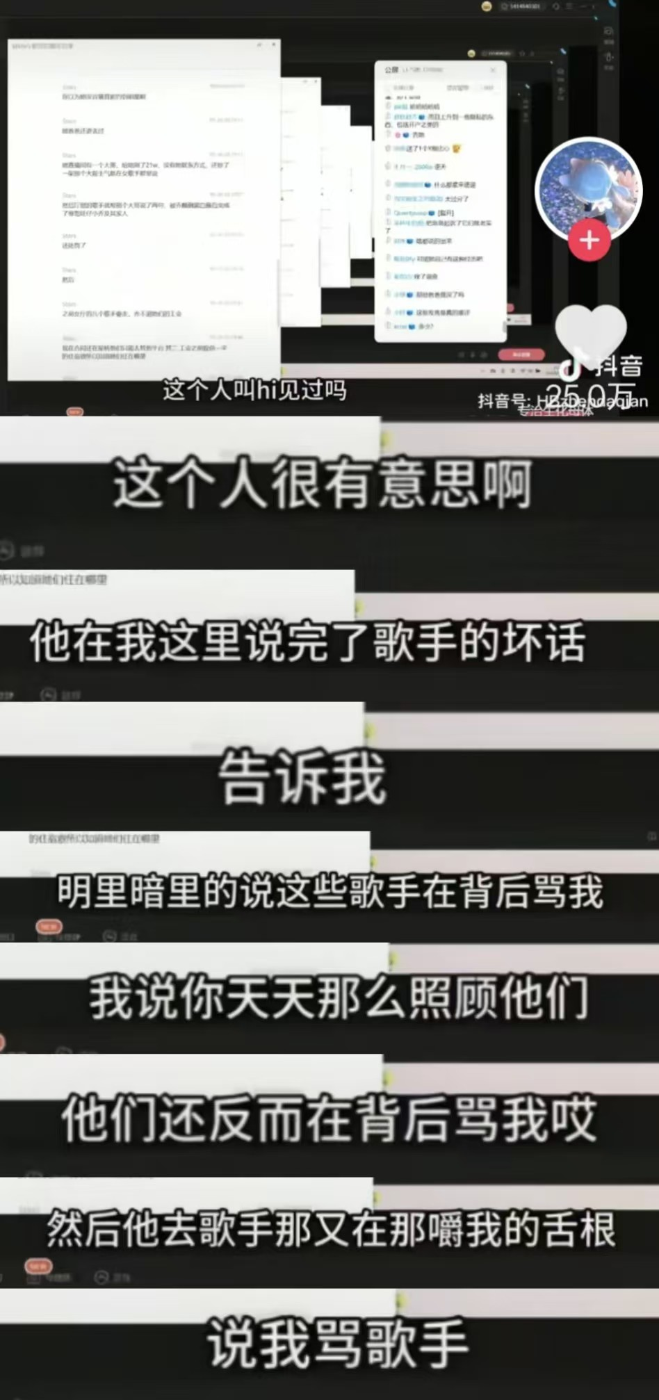 事情還沒完。該網(wǎng)友爆料,自己一周給旺仔小喬送出24個嘉年華,卻慘遭背刺。旺仔小喬在直播間公然引導(dǎo)粉絲網(wǎng)暴他,稱“這個人叫hi,見過嗎?這個人很有意思啊,他在我這里說完了歌手的壞話,告訴我,明里暗里的說這些歌手在背后罵我……然后他去歌手那又在那嚼我的舌根,說我罵歌手”。