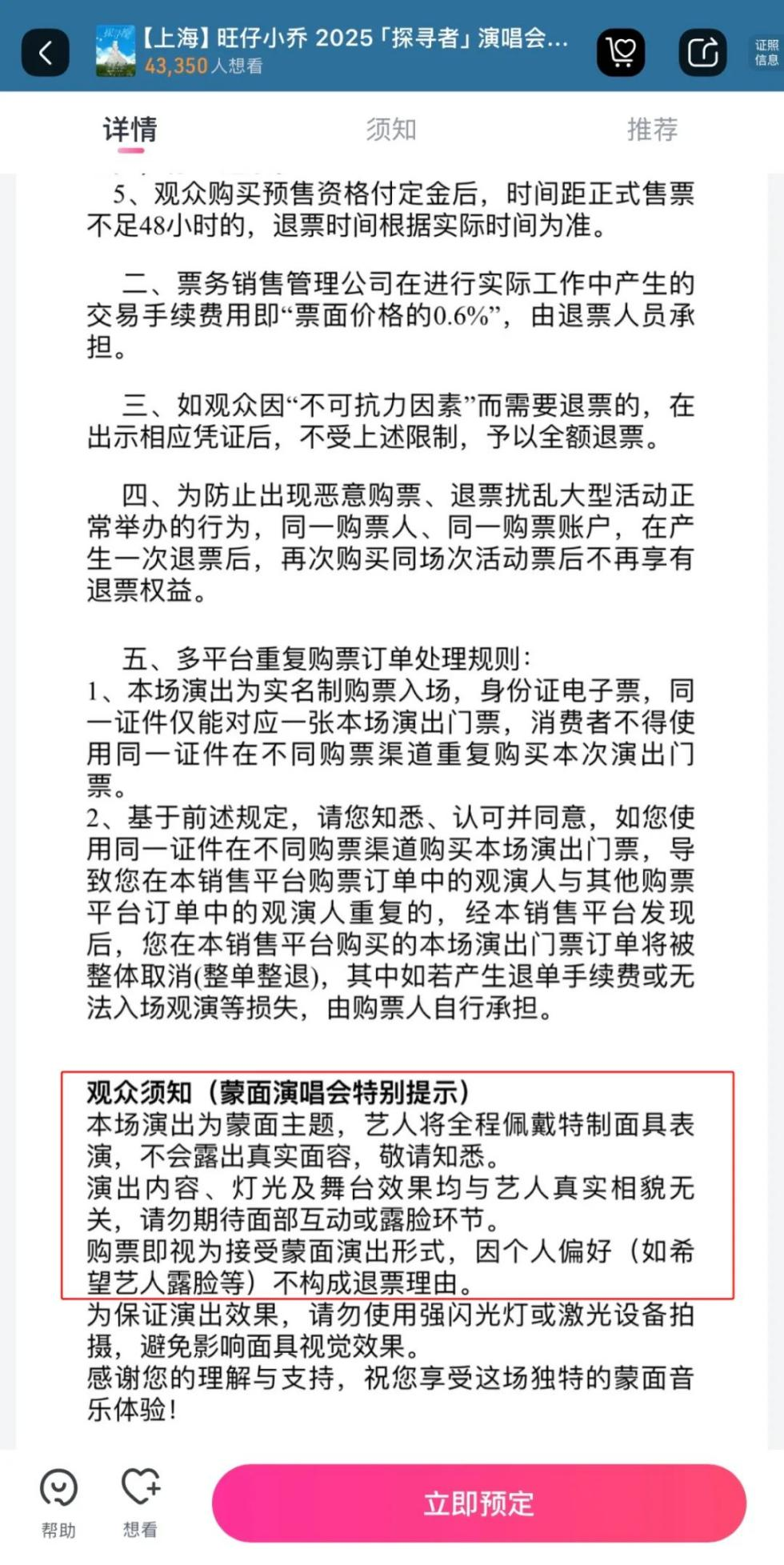 今年7月,旺仔小喬官宣8月初在上海舉辦首場個人演唱會,演出以不露臉形式進(jìn)行,稱“本場演出為蒙面主題,藝人將全程佩戴特制面具表演,不會露出真實(shí)面容,敬請知悉。演出內(nèi)容、燈光及舞臺效果均與藝人真實(shí)相貌無關(guān),請勿期待面部互動或露臉環(huán)節(jié)。購票即視為接受蒙面表演形式,因個人偏好(如希望藝人露臉等)不構(gòu)成退票理由”。