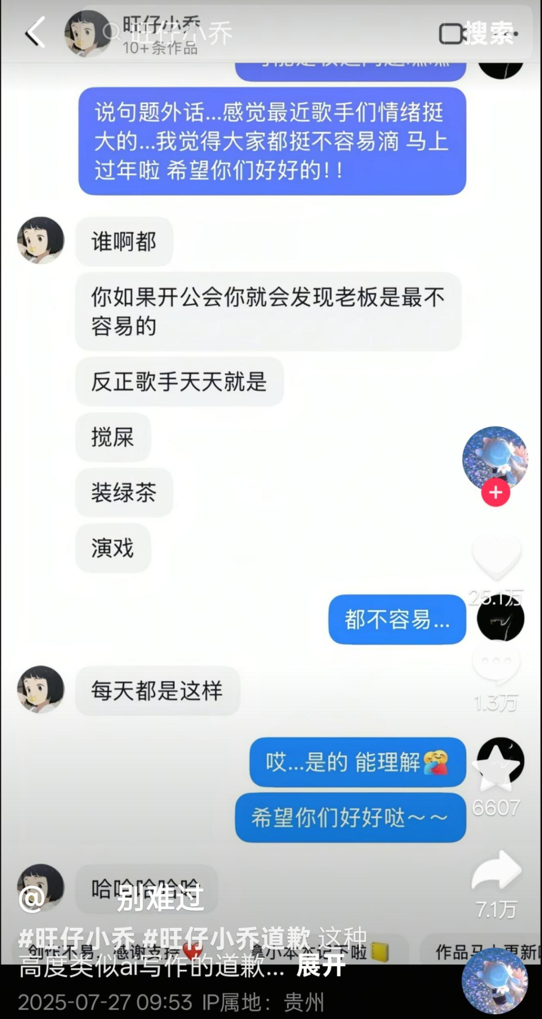 但從網(wǎng)友提供的聊天截圖看,是旺仔小喬在嚼其他歌手舌根,比如她說“反正歌手天天就是攪屎、裝綠茶、演戲”。