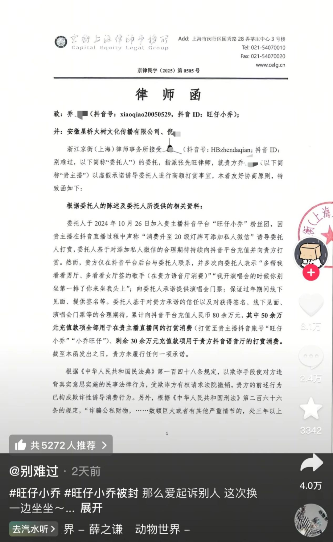 其實(shí)早在今年8月,該網(wǎng)友就向旺仔小喬發(fā)起了律師函,還在社交平臺曬出內(nèi)容,要求旺仔小喬全額返還充值打賞的80萬元,并表示若律師函送達(dá)起5日之內(nèi)不履行義務(wù),將直接起訴。如今看來,事情有了新的走向。