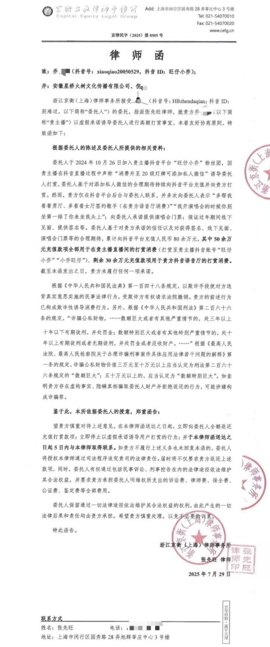 從律師函內(nèi)容可知,該網(wǎng)友于2024年10月26日加入“旺仔小喬”粉絲團(tuán)。旺仔小喬在直播中聲稱“消費(fèi)升至20級燈牌可添加私人微信”,誘導(dǎo)該網(wǎng)友打賞。然而,網(wǎng)友完成打賞后,旺仔小喬僅在抖音平臺后臺與其聯(lián)系,并未加上私人微信。
