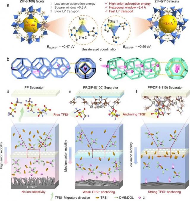 MOFs材料的晶面結(jié)構(gòu)直接決定其與離子的相互作用,團隊對比ZIF - 8的(100)與(110)兩種晶面后,選擇暴露(110)晶面。(110)晶面表面存在大量不飽和鋅位點(路易斯酸位點),對電解液中的TFSI ?陰離子(電池中阻礙鋰離子傳輸?shù)闹饕庪x子)的吸附能量更強(Ead,TFSI ? = - 0.50 eV,高于(100)晶面的 - 0.47 eV)。