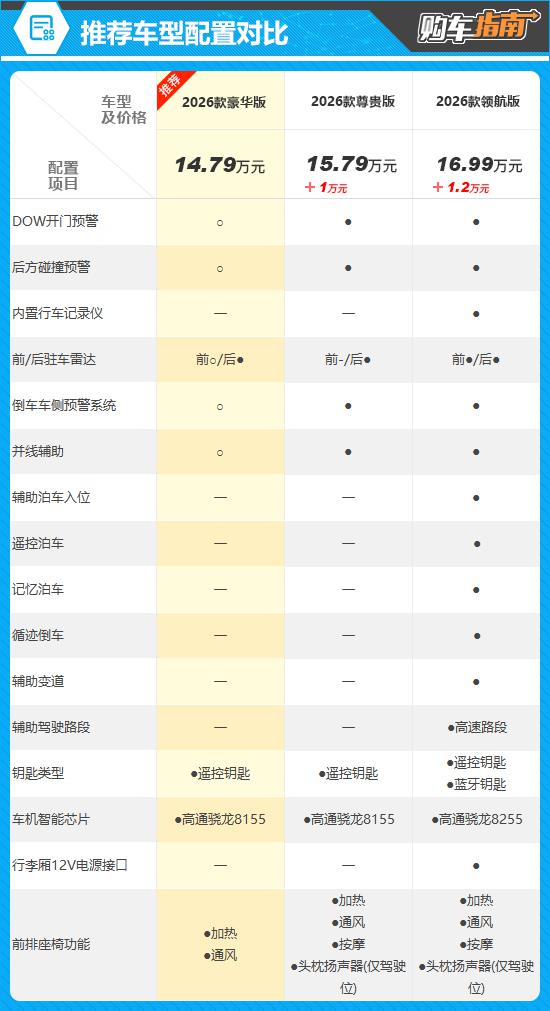 目前在售的3款車型中,更推薦豪華版。高一級(jí)別車型相比推薦車型,配置提升主要在舒適性、主動(dòng)安全和駕駛功能方面,如后方碰撞預(yù)警、并線輔助、前排座椅按摩功能等。雖然配置有提升,但需增加1萬(wàn)元預(yù)算,性價(jià)比不高。而且部分配置,推薦車型有選裝機(jī)會(huì),可按需選擇。