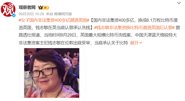 2.中國(guó)新聞周刊:《攜帶500億元比特幣出逃,47歲女子錢志敏在倫敦當(dāng)庭認(rèn)罪》