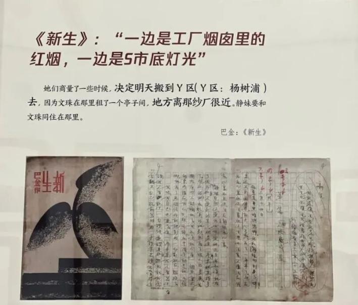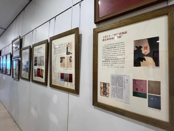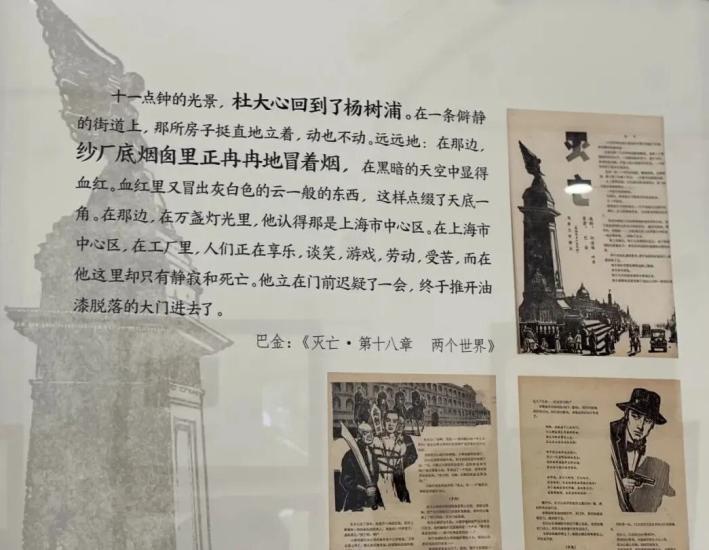 走進(jìn)展廳,首先映入眼簾的是上篇——“巴金與楊浦百年工業(yè)”。這里聚焦巴金早期小說(shuō)《滅亡》《新生》等作品中描繪的楊樹(shù)浦工廠景象,經(jīng)過(guò)精心排版并配以文字說(shuō)明,以“紗廠、煙囪、包身工”等一系列高頻出現(xiàn)的典型意象,生動(dòng)地刻畫了小視角背后的大時(shí)代,展現(xiàn)出20世紀(jì)30年代楊浦的工業(yè)面貌和工人運(yùn)動(dòng)狀況。