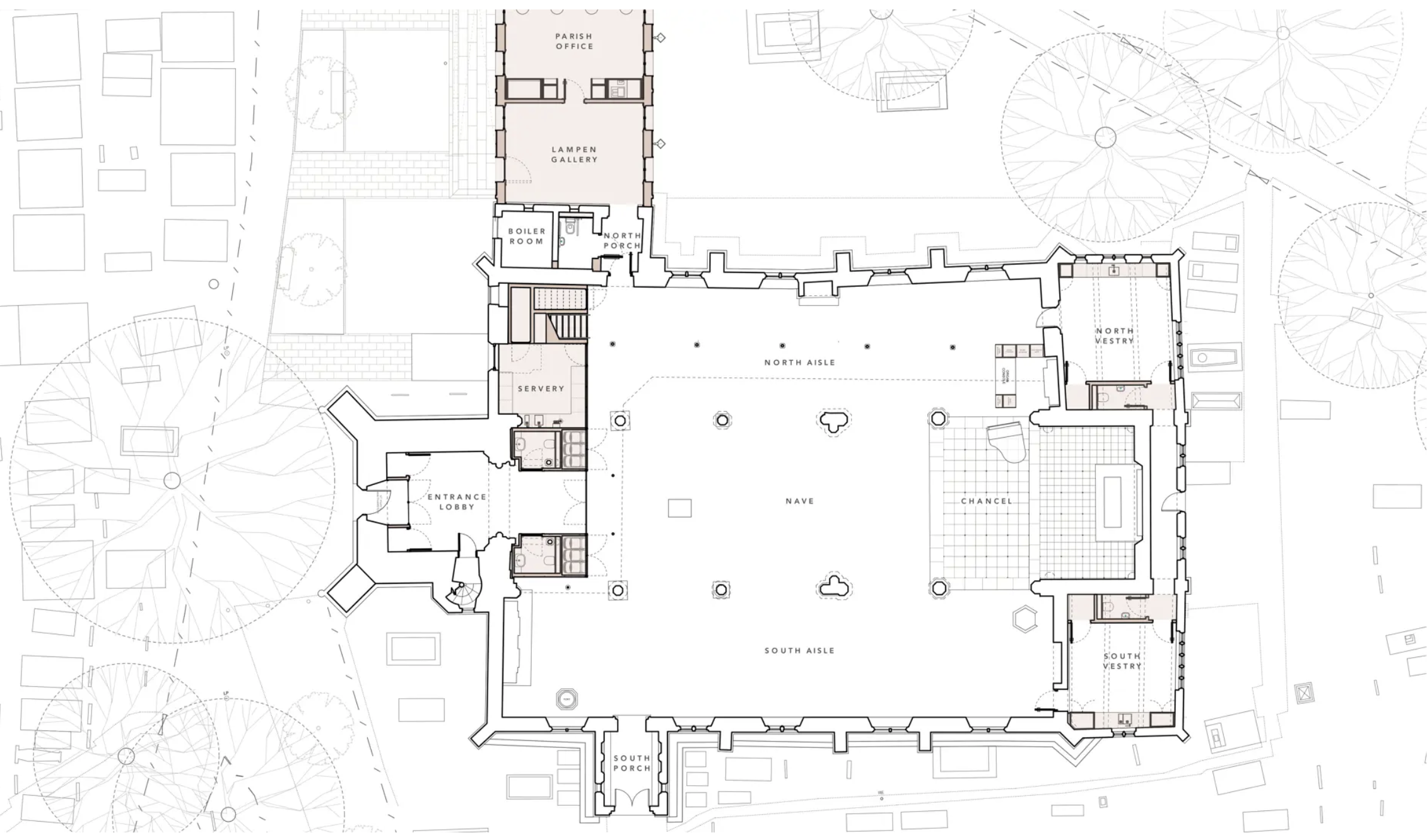 該項目起初只是修復(fù)和維護工作,在斯派塞設(shè)計指導(dǎo)下,逐漸演變成全面革新。設(shè)計兼顧環(huán)境與當(dāng)代性,擴建部分形式和細節(jié)參考了教堂及其周邊環(huán)境。