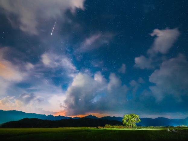 拍攝銀河時,突然有一顆超亮火流星劃過!它拖著金紅色的尾巴劃過銀河,幸運(yùn)地被相機(jī)捕捉到了。