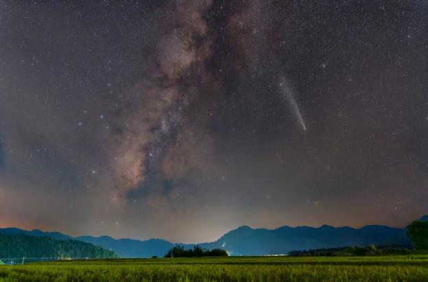 夜幕降臨,青云漸漸散去。仰望星空,璀璨的銀河正緩緩升起,而紫金山 - 阿特拉斯彗星也如約而至,一切都來得恰到好處。