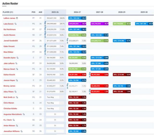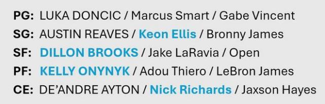 詹姆斯、東契奇、八村壘、里夫斯、范德比爾特、文森特、克勒貝爾、艾頓、拉拉維亞、斯馬特、克內(nèi)克特、海斯、布朗尼、蒂耶羅;科洛科、馬農(nóng)、小尼克 - 史密斯(三個(gè)雙向合同)