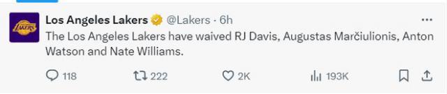 北京時(shí)間10月19日,洛杉磯湖人隊(duì)官方宣布裁掉奧古斯塔斯 - 馬爾丘利奧尼斯、RJ - 戴維斯、內(nèi)特 - 威廉姆斯和安東 - 沃森四位訓(xùn)練營(yíng)合同球員,這四人可以被南灣湖人簽下征戰(zhàn)G聯(lián)賽。