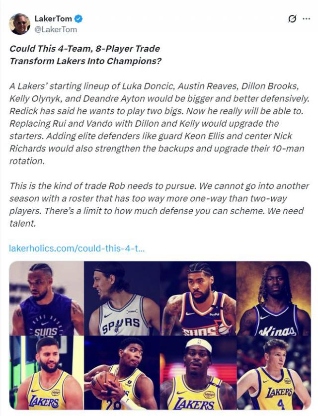 湖人媒體Laker Tom卻認(rèn)為這支湖人隊(duì)還是應(yīng)該交易補(bǔ)強(qiáng),大概率是覺得這套14 + 3名單根本沒有奪冠的可能性。他覺得進(jìn)行一筆四方交易可以幫助湖人蛻變,他表示:湖人應(yīng)該繼續(xù)提升這支球隊(duì)的防守能力與尺寸,狄龍、奧利尼克、理查茲、埃利斯等人都是很好的補(bǔ)強(qiáng)人選。