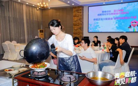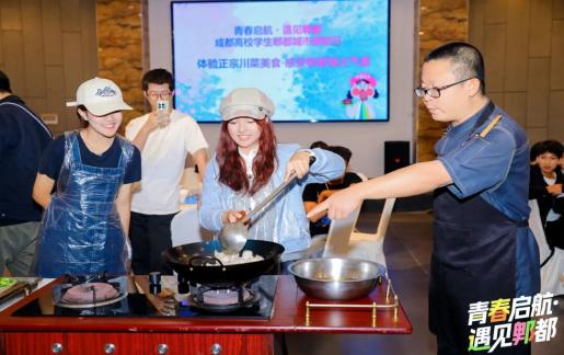 中午,學(xué)子們跟著紅星飯店廚師長學(xué)習(xí)炒正宗的回鍋肉,體驗(yàn)感十足。
