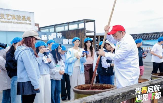 在郫縣豆瓣中國非遺文化體驗(yàn)園,學(xué)子們深入了解郫縣豆瓣的文化傳承和生產(chǎn)流程,還跟著國家級(jí)非遺傳承人學(xué)習(xí)“翻、曬、露”的古法工藝體驗(yàn)。