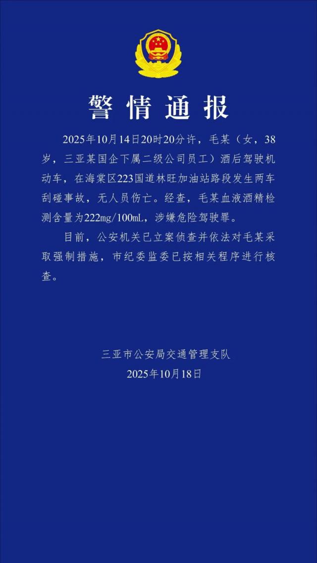 2025年10月14日20時20分左右,毛某(女,38歲,三亞某國企下屬二級公司員工)酒后駕駛機動車,在海棠區(qū)223國道林旺加油站路段發(fā)生兩車刮碰事故,沒有人員傷亡。經過檢查,毛某血液酒精檢測含量為222mg/100mL,涉嫌危險駕駛罪。