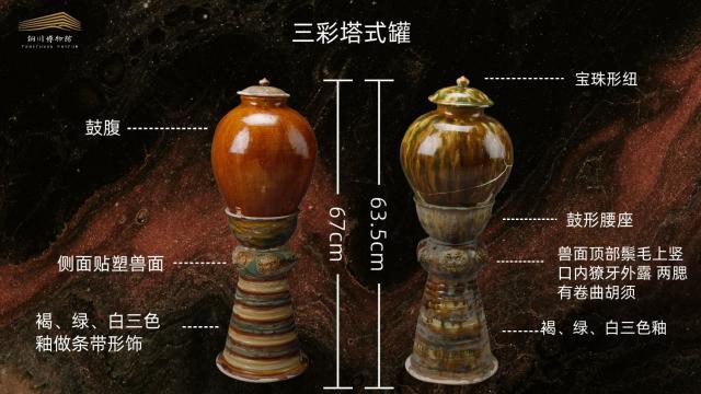 在銅川博物館中,有兩件極具特色的三彩塔式罐值得我們細(xì)細(xì)賞鑒。