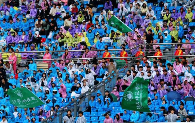 我市多所高校組織萬(wàn)人啦啦隊(duì)到場(chǎng)吶喊助威。