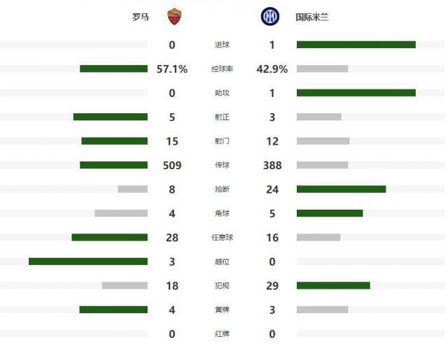 第55分鐘,迪巴拉大禁區(qū)前沿任意球直接攻門,皮球繞過人墻直奔左下角,但仍被索默飛身撲出??块T將保住1球領(lǐng)先的國際米蘭,在比賽常規(guī)時間最后時刻本有機會擴大優(yōu)勢。弗拉泰西右路下底倒三角傳中,門前包抄的姆希塔良直接打門,可惜皮球擊中立柱外側(cè)彈出。雖未擴大領(lǐng)先優(yōu)勢,但國米沒給羅馬扳平機會,如愿從客場帶走三分。