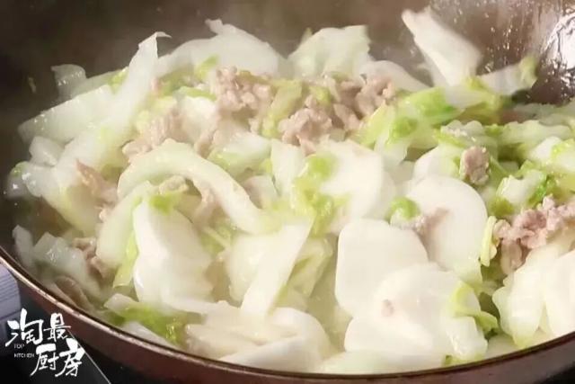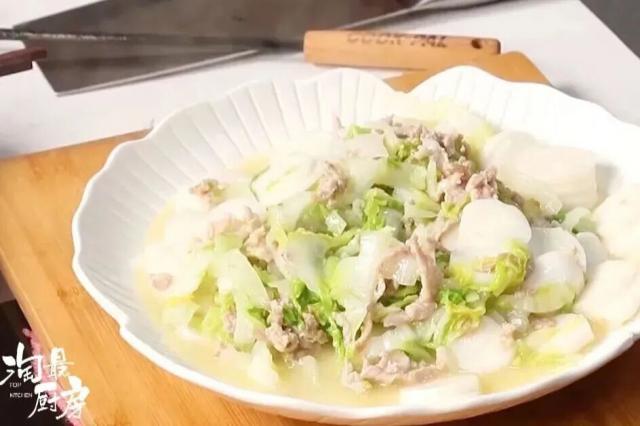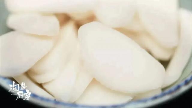 這次廚房請(qǐng)來了張鈞大廚,做一道帶湯水的黃芽菜炒年糕。雖然少了點(diǎn)油脂香,但吃起來更加軟糯,食材本身的鮮香也能更好地展現(xiàn)出來。