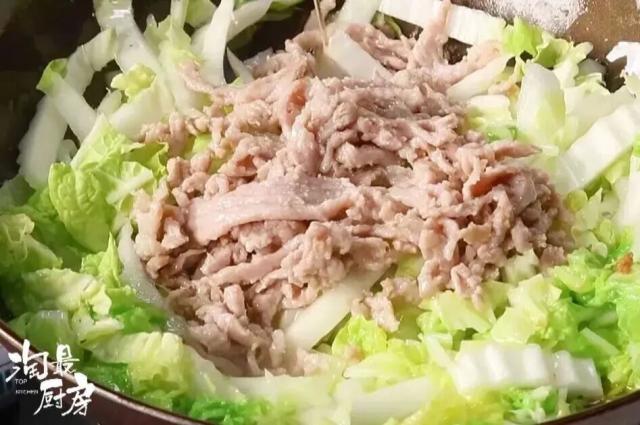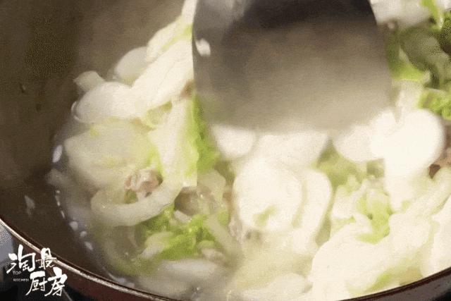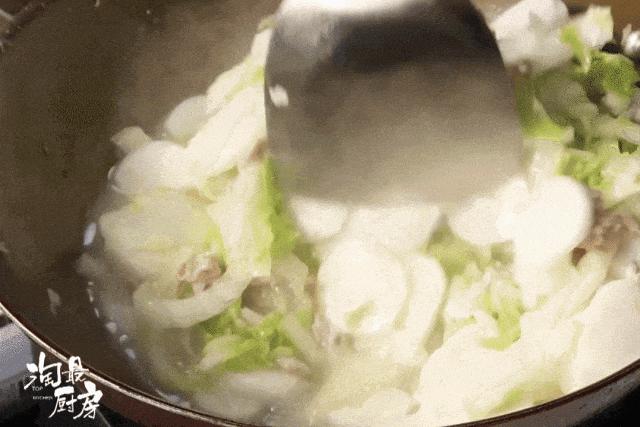 利用大白菜的水汽把年糕燜軟,
