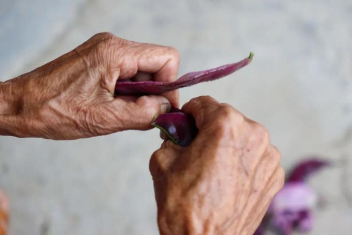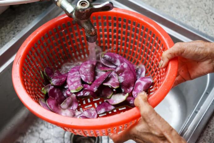 不一會兒,籃子就被裝滿了?;氐郊抑?,費阿嬢立刻著手處理新鮮的扁豆,她將兩端的老筋撕去,再用清水反復(fù)沖洗干凈,隨后整齊地碼在盤子里,準備烹制一道時令美味——油燜扁豆。