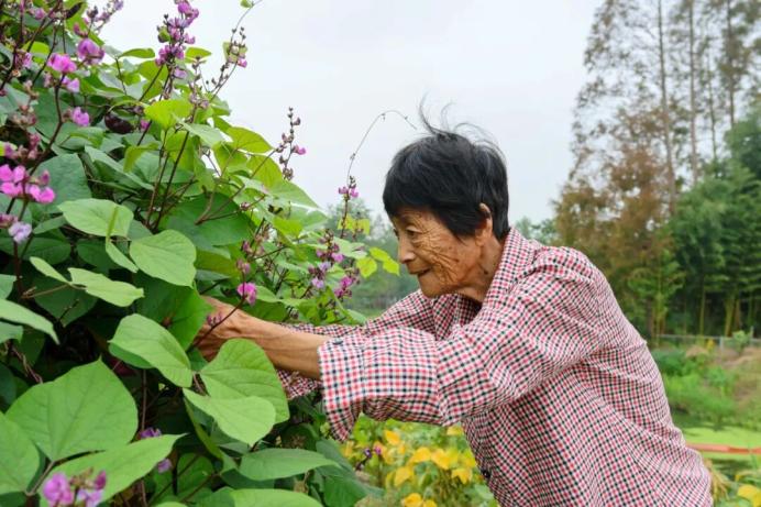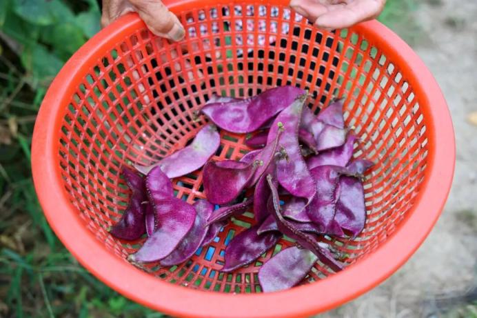 村民費阿嬢的菜園里,翠綠的藤蔓順著架子層層纏繞,紫紅色的豆花綴滿枝頭,一串串紫瑩瑩、綠油油的扁豆迎風搖曳,成為秋日里一道亮眼的風景線。
