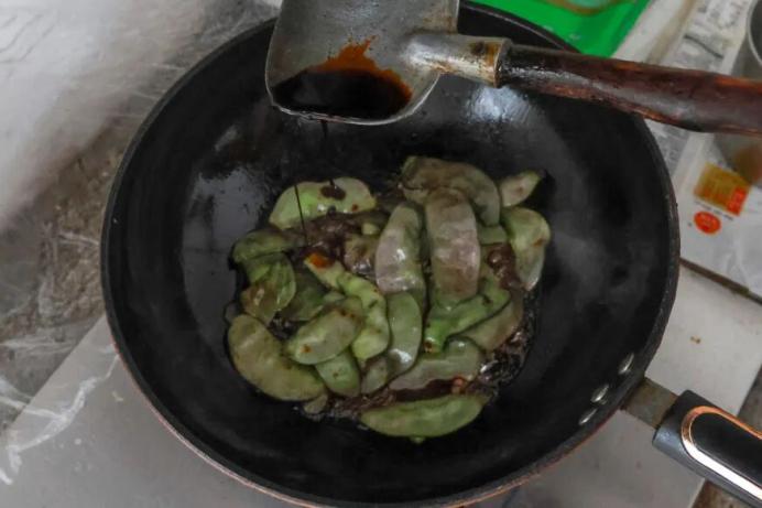 鐵鍋燒得微微發(fā)燙,倒入適量菜籽油,油熱后,放入大蒜瓣爆香,緊接著將處理好的扁豆倒入鍋中快速翻炒。隨著“滋滋”的聲響,扁豆的顏色逐漸由淺變深。此時,費阿嬢舀入兩勺醬油,再加入少許白糖提鮮,翻炒均勻后,蓋上鍋蓋燜煮兩分鐘,使其充分吸收湯汁。