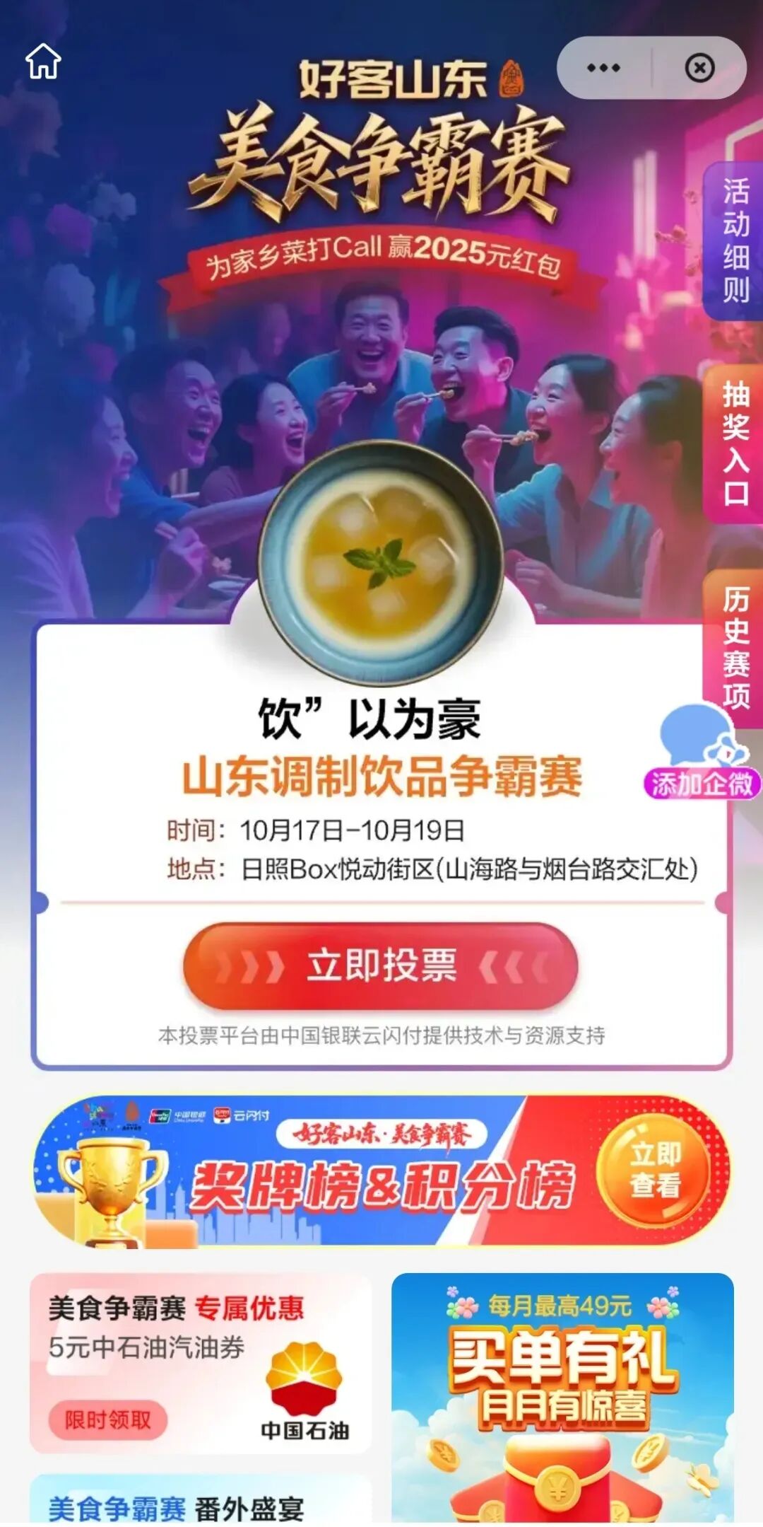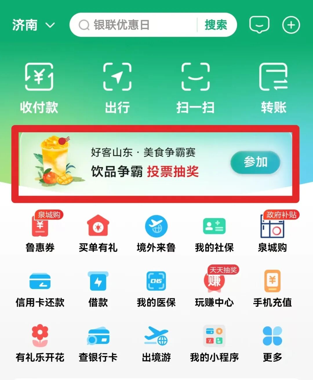 掃描上方二維碼,或打開云閃付APP首頁點(diǎn)擊進(jìn)入“好客山東美食爭霸賽”