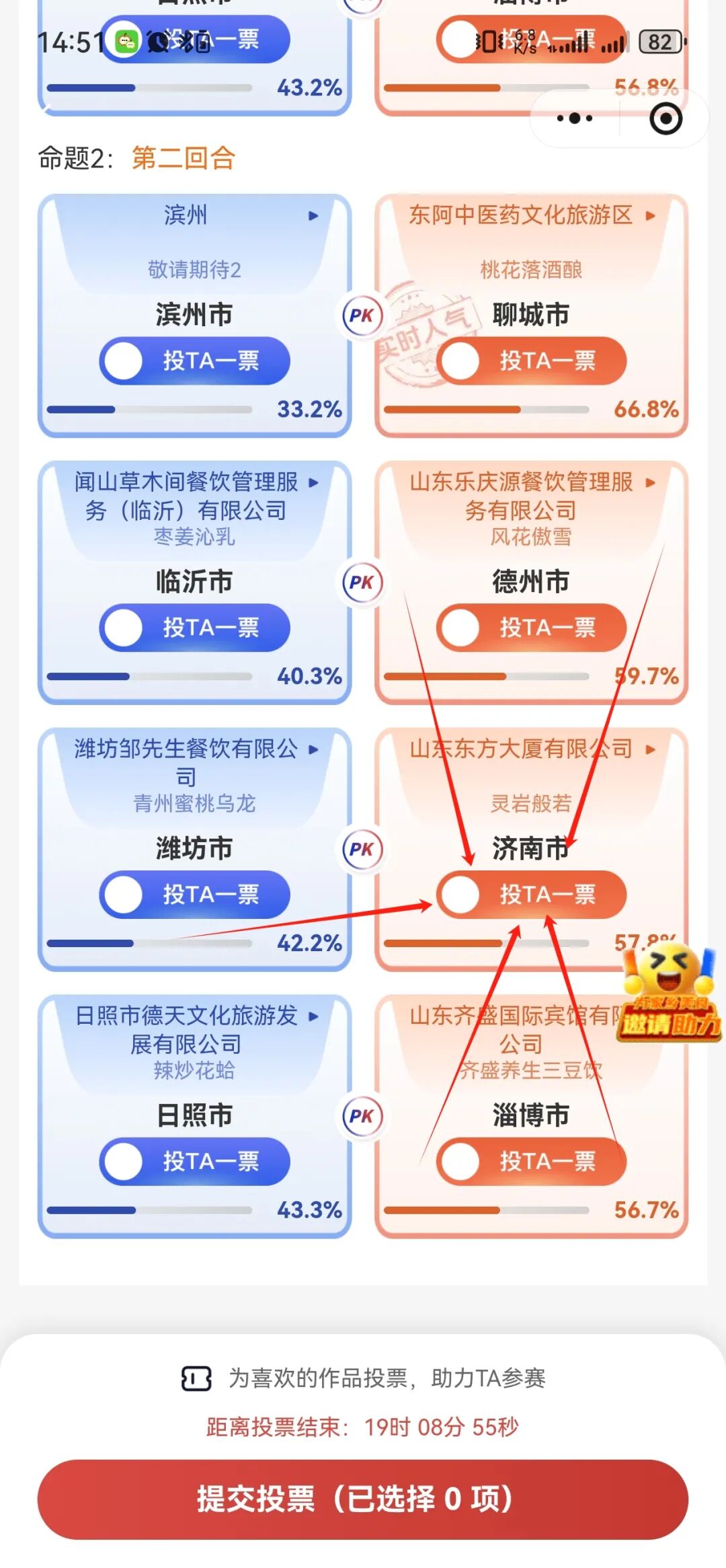 美食爭霸賽投票界面“邀請助力”功能,點(diǎn)擊可選擇您希望助力的城市,生成城市專屬鏈接,邀請好友一起參與投票!助力家鄉(xiāng)美食出圈!