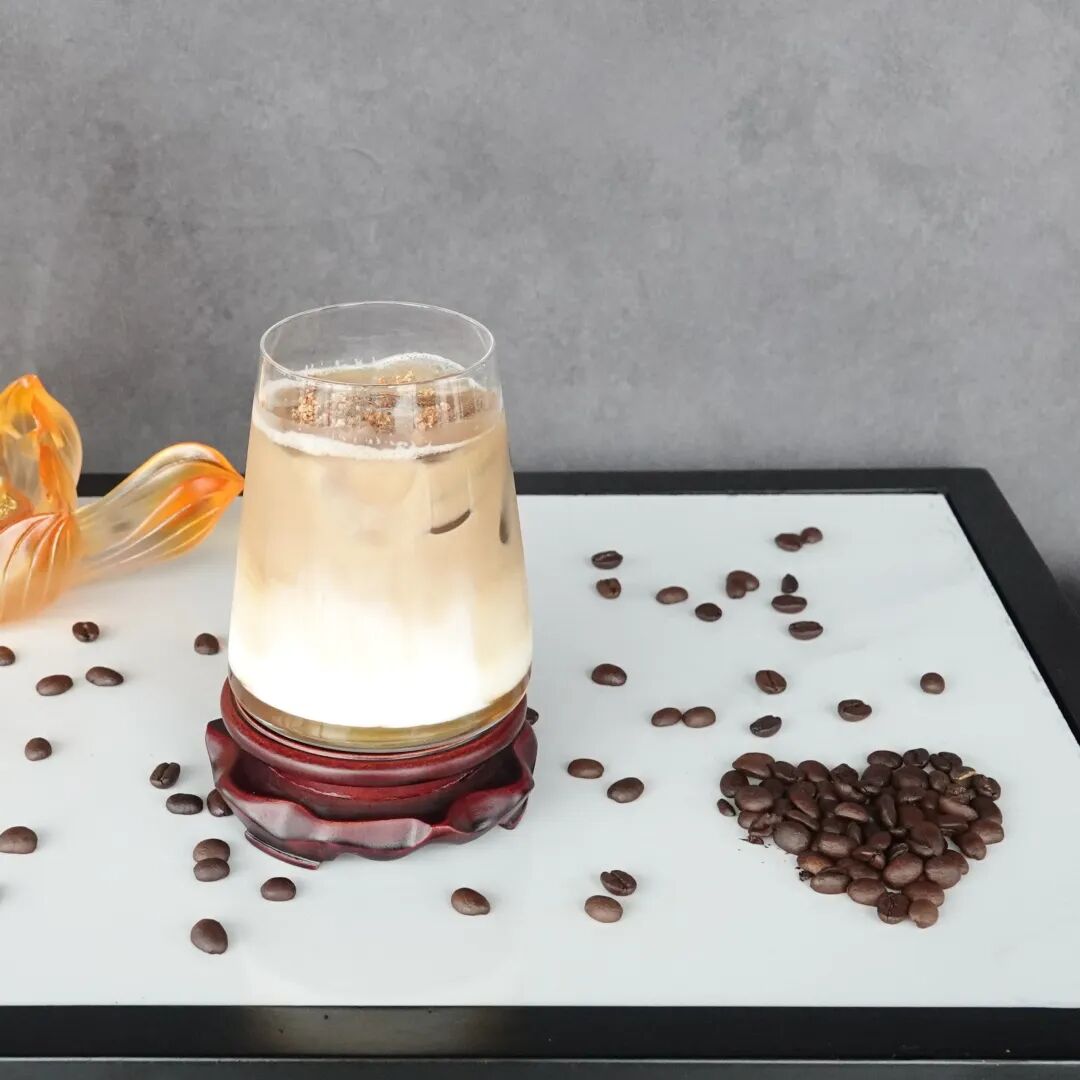 「千佛晨光」:基底是濃縮咖啡 + 鮮牛乳;輔料有阿膠糖漿(平陰特產(chǎn))、肉桂粉、脆棗碎??诟写己窬d密,棗香與咖啡焦香交融。它寓意著千佛山清晨佛光與城市蘇醒之景,阿膠與棗碎寓意“養(yǎng)生福地”。