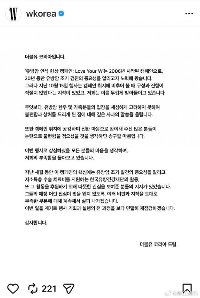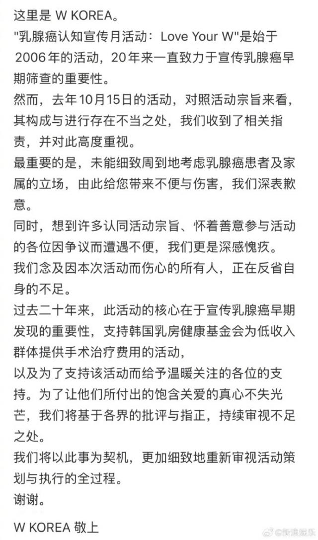面對輿論,《W Korea》10月19日發(fā)布道歉聲明,進行雙重致歉:一是向乳腺癌患者及家屬可能受到的傷害道歉;二是向善意參與卻感到困擾的人致歉。雜志方承認活動策劃和執(zhí)行偏離公益初心,未考慮患者立場。他們承諾刪除各平臺相關內容,全面整改,重新審查活動流程,回歸“早期篩查援助”核心目標,并接受社會監(jiān)督。