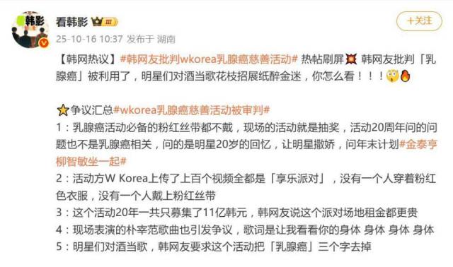 但這波道歉未能平息所有質疑。網友嘲諷現(xiàn)場是“貴族派對”,指出明星飲酒社交、奢侈品公關眾多,公益成了配角。韓網熱帖犀利指出:“直接叫聯(lián)誼會不行嗎?非要消費乳腺癌!”